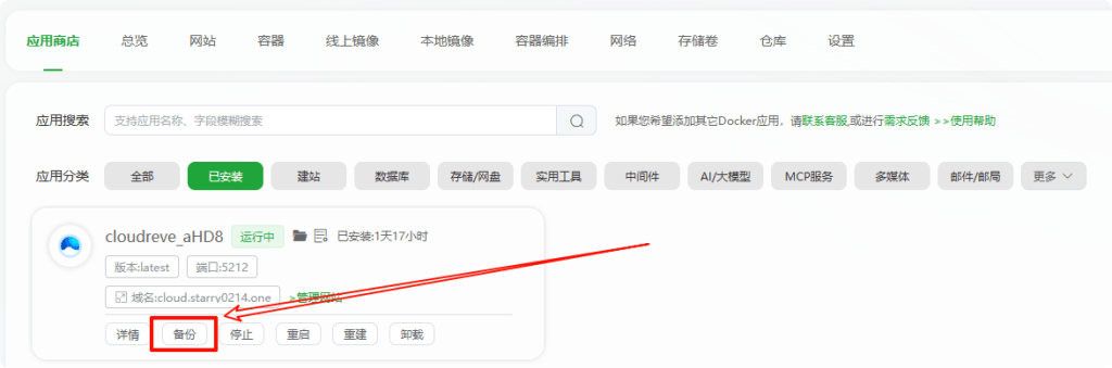 在宝塔面板的docker功能中,进入docker的应用商店选择已安装的分类,选择要备份的应用进行备份,如下图: